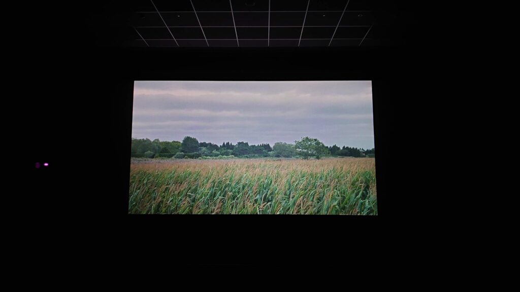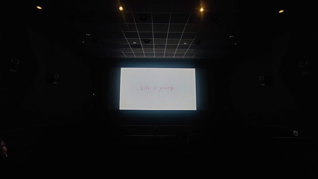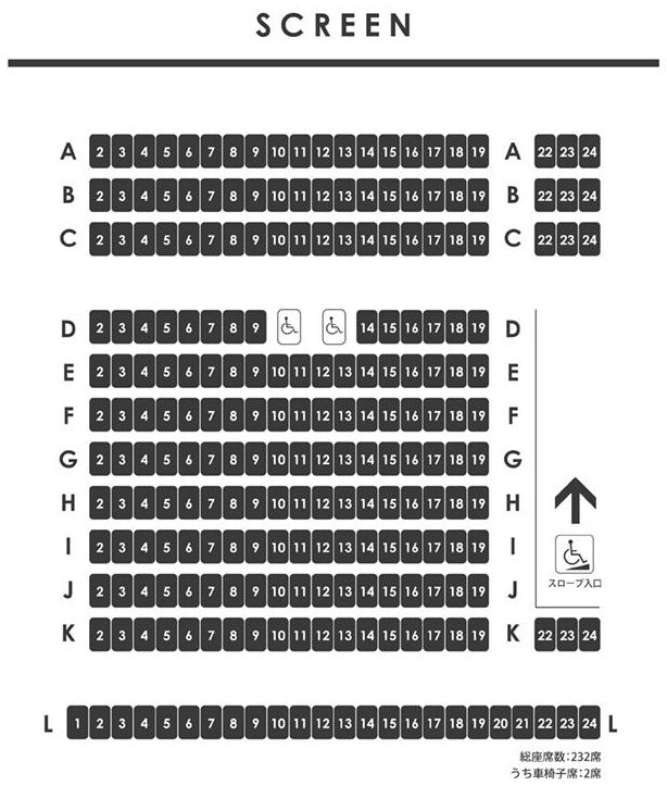 新宿ピカデリー スクリーン6の座席表を見ればわかるが、スクリーンに向かって右に1つの入口があり、縦方向の通路は左右に2つ。座席配置は左右非対称なので座席配置だけでは中央がよくわからない。実際に劇場で見ると横は12列目が中央になっている。縦方向についてはJ列が歪みが最も少なく見やすいスクリーンサイズ。なので、J-12がオススメの座席となる。